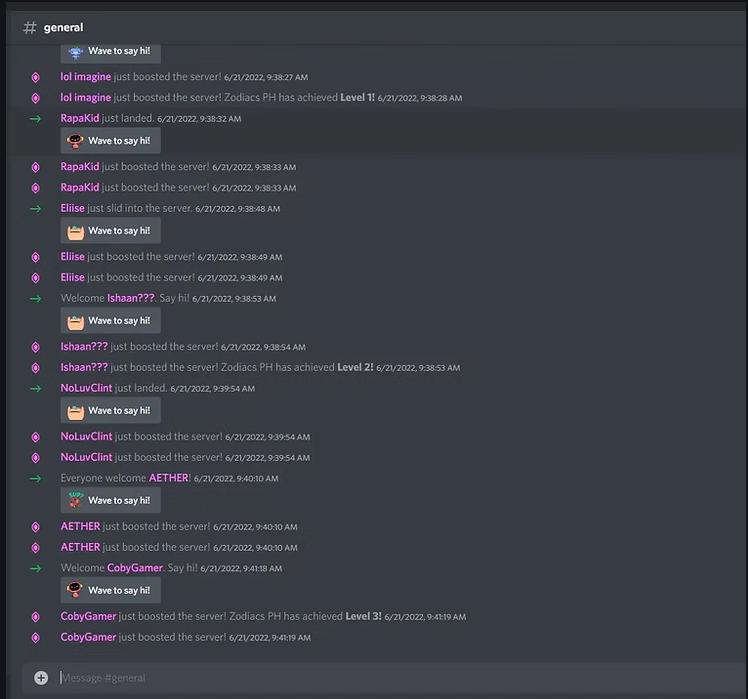 Screenshot of an active Discord server filled with users and boost notifications, showcasing an engaged and growing community.